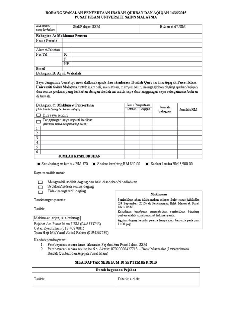 Borang Wakalah Penyertaan Ibadah Qurban Dan Aqiqah 1436 Pdf